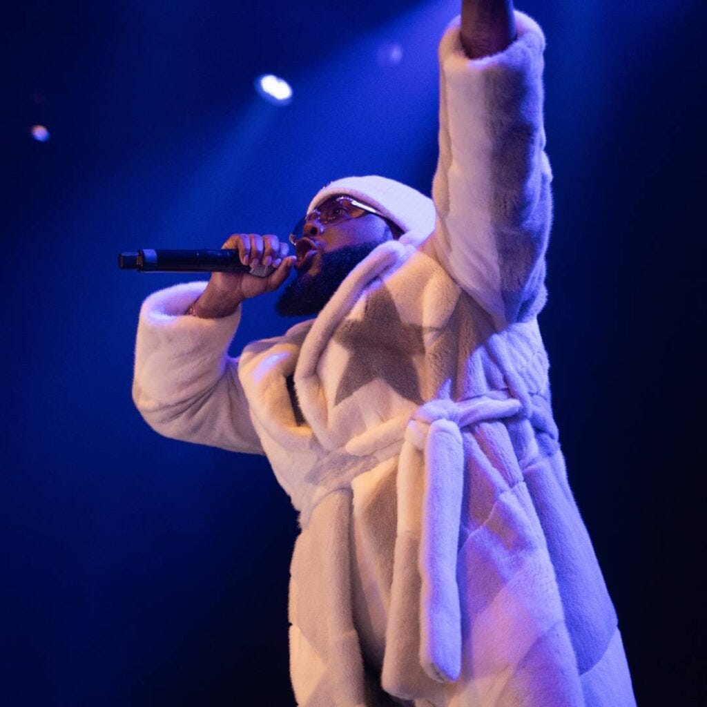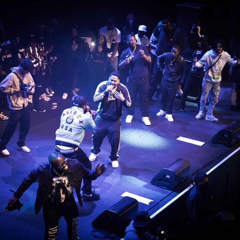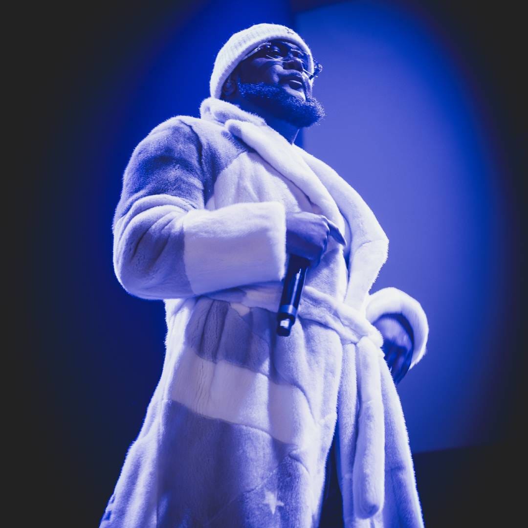 Greedo pops out, walking across the stage like a victorious gladiator. Cartier frames, Denim Tears jeans, a white and gray Louis Vuitton-by-Virgil mink that runs for $50K. He looks relieved, grinning and pacing around while occasionally peeping behind his shoulder for his folks. Amid the wall of sound, it seems most people here underestimated just how herculean this performance would be: Greedo was not only physically present, but a commanding and inviting performer betraying his years in isolation. That the man started off with an unreleased song is the most patently audacious part of all this, and though of course no one knows the words, “Rich On Grape Street” is heavy artillery. “Wockhardt spilled on my Margielas / I got rich and all y’all jealous,” he wails through black and purple minor synths that sound almost like the “Never Bend” beat was uncoiled. It recalls a recent admission from Weezy to Andre Gee that his favorite song is whichever his next song is. It reflects a mind deeply committed to prolific output, but it also makes sure things are positioned straight ahead. After everything Greedo’s been subjected to, and in a robe this fly, why would we look in any other direction? “I’m back, that shit easy,” he mutters into the mic just five minutes in.