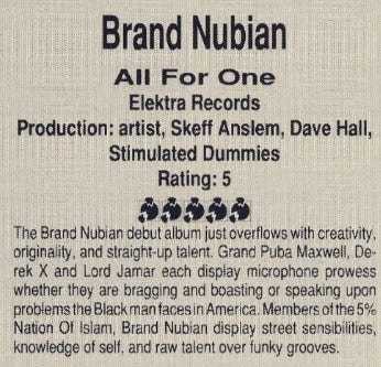 The trio produced an album that flexed brain and bottom, freeing political diatribe from the throbbing production of the Mind Squad and grounding it in the everyday, making it danceable and cool. The production team of Brand Nubian themselves, Dante Ross and Dave Hall set the stage sonically for Q-Tip and Tribe. And The Source was quick to jump on it, declaring itself as a publication that highly valued Brand Nubian and The Native Tongues brand of scholarly, racially informed, politically aware lyricism that maintained its funk at all times.