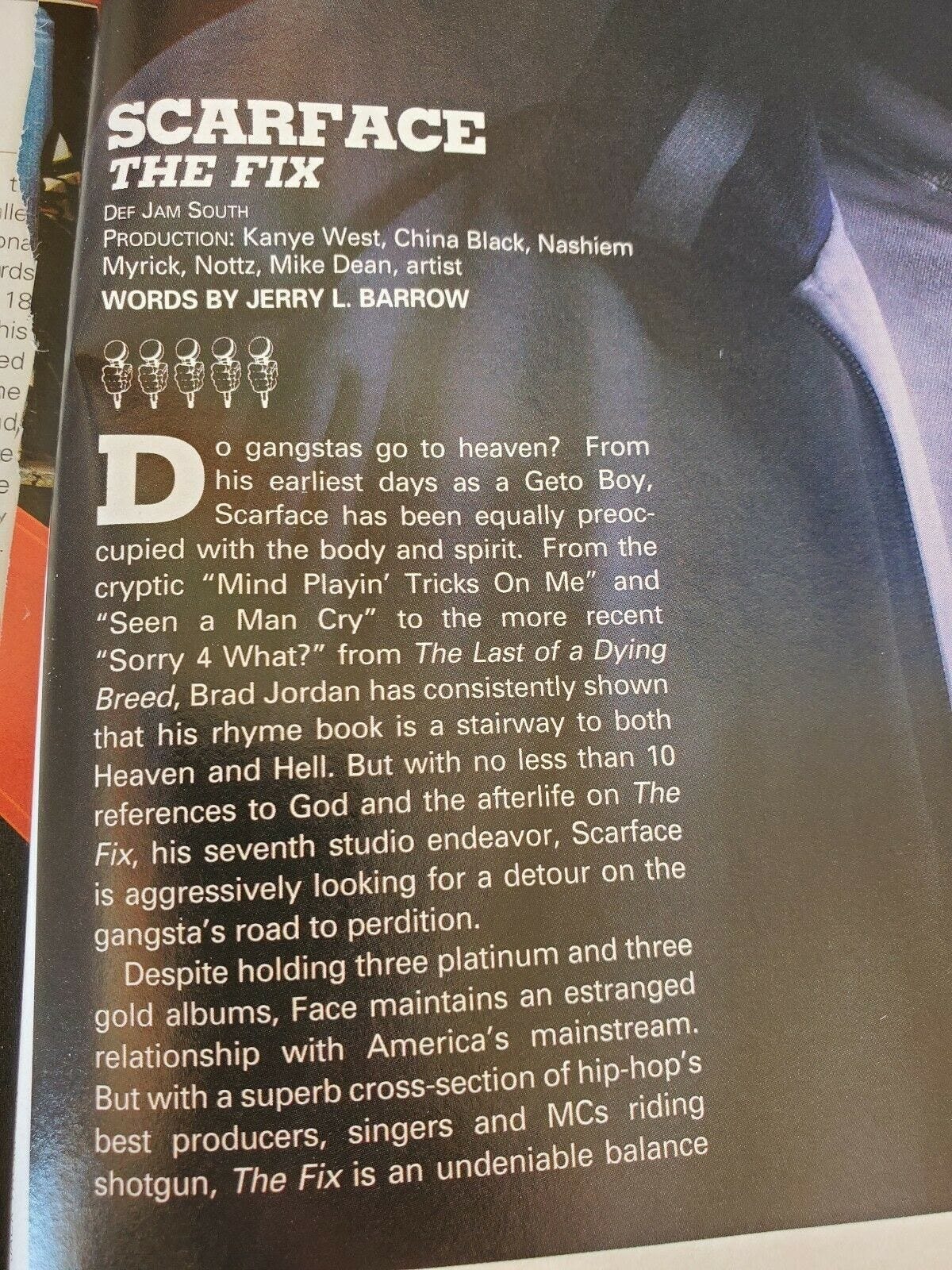 Writer Jerry L. Barrow’s review brings out an interesting element of the album, a quality Scarface could only have achieved with age and time. The Fix is at times a morose and remorseful album, a quality that would dominate the aughts for Face, in what was a great decade that rivaled his incredible run in the 90s (Almost 10 FUCKING YEARS AGO, I wrote to this quality myself, in what I’m pretty sure was my first piece ever for this site). It’s a credit to the critic for recognizing this quality, and in my mind, gives Face an edge over Jay-Z, because while Jay-Z more or less refined his schtick for his 5-mic bid, Face introduces something, if not new, more pronounced in his music, a pretty incredible accomplishment 18 years into his already legendary career.