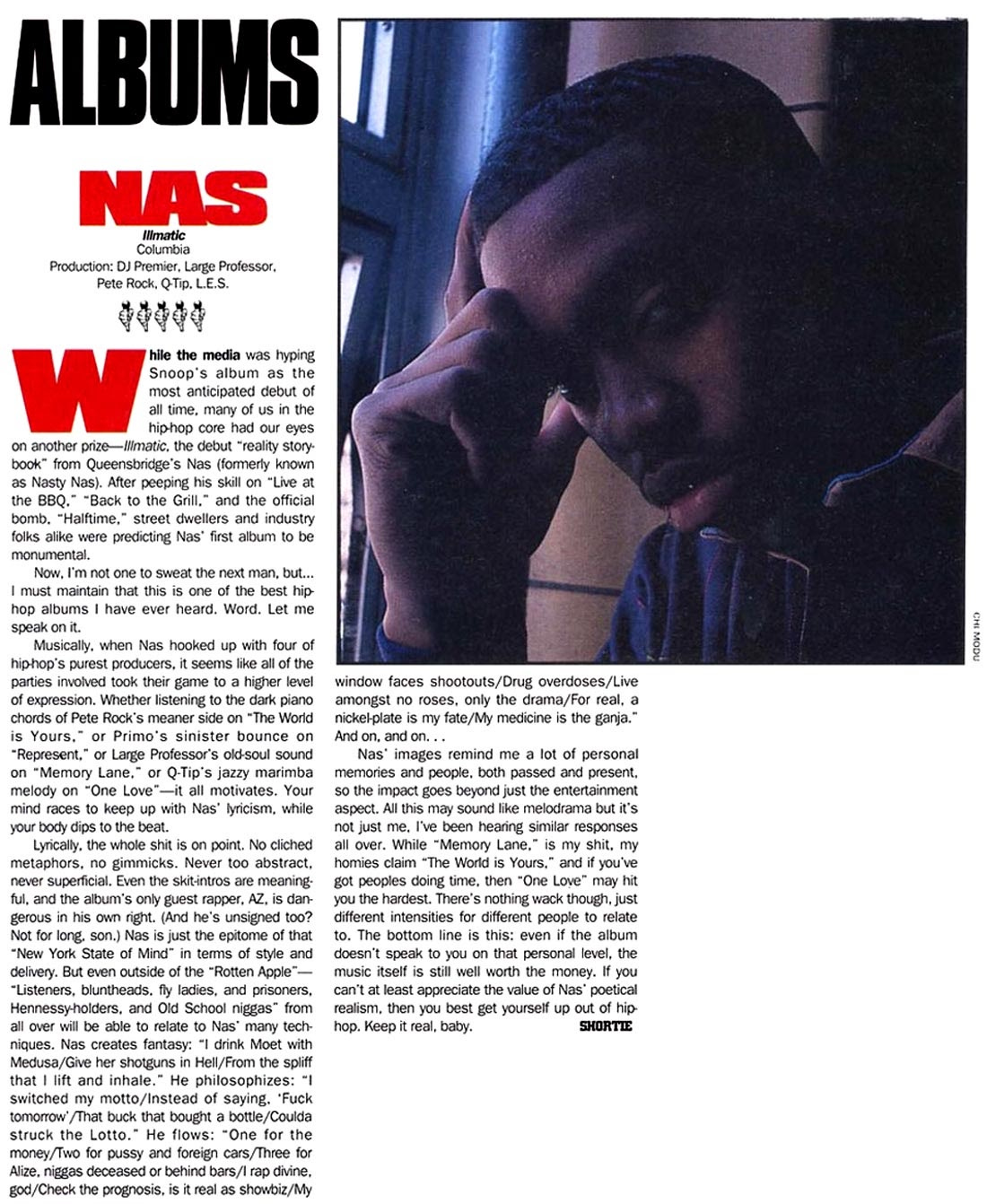 It’s a frustrated, aching work of art that doesn’t sound like one without proper reflection. They gave us all the album we didn’t want, but we needed, and they had to make. De La made convoluted pastiches, ransom notes composed of letters cut out of an infinite sampling of every form of media on display at a LIRR magazine stand and super glued onto a single album. That The Source, so early in its life, was able to parse through the noise and recognize the perfect imperfections of this project, to immediately grasp the intentionality of the effort and appreciate its overstuffed brilliance, is remarkable. Decades later, I can’t help but feel that the original triptych of De La and Prince Paul collabs represents the closest this era of primordial New York hip hop came to disruptive, chaotic, rule breaking art. The De La/Prince Paul brain trust was Marcel Duchamp, and De La Soul is Dead was their urinal. 2. Illmatic – Nas