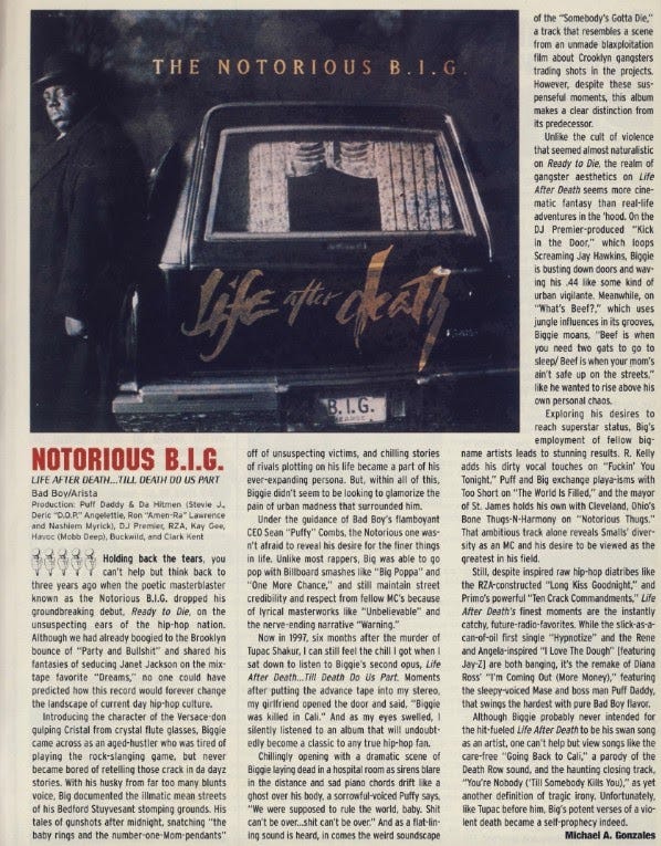I can’t really express how much sympathy I have for Michael A. Gonzales. People were openly weeping in the streets when Biggie died. It was fucking shocking. I was 12 years old, and I sobbed. For people who didn’t even like rap, this was a cultural touchstone. But the question when considering Life After Death in this context is how much did Biggie’s death influence the actual album’s rating?