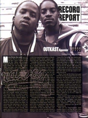 But it’s not just a matter of resume building. Who Outkast was mattered. They were literary, intelligent and grounded in a way that makes sense to All The Critics in New York. Their spacey urbanity gave a Southern twang to a language Nas and the Native Tongues had consecrated earlier in the decade. In retrospect, while it came later than it should’ve, Outkast was the perfect vessel to break The Source’s Mason Dixon line.