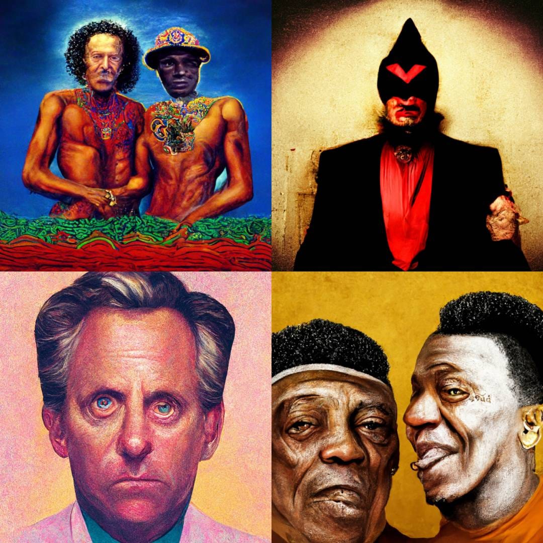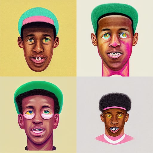 So I put in the prompt “an odd future album with every member, style of eric white (the guy who designed Tyler, The Creator’s pleasant Flower Boy cover)” and got the above image. The A.I. must’ve interpreted the prompt as a request for a facemash of every Odd Future member, which is only slightly less terrifying than those memes that blended the faces of Congresspeople and Supreme (pun-intended) Court Justices.