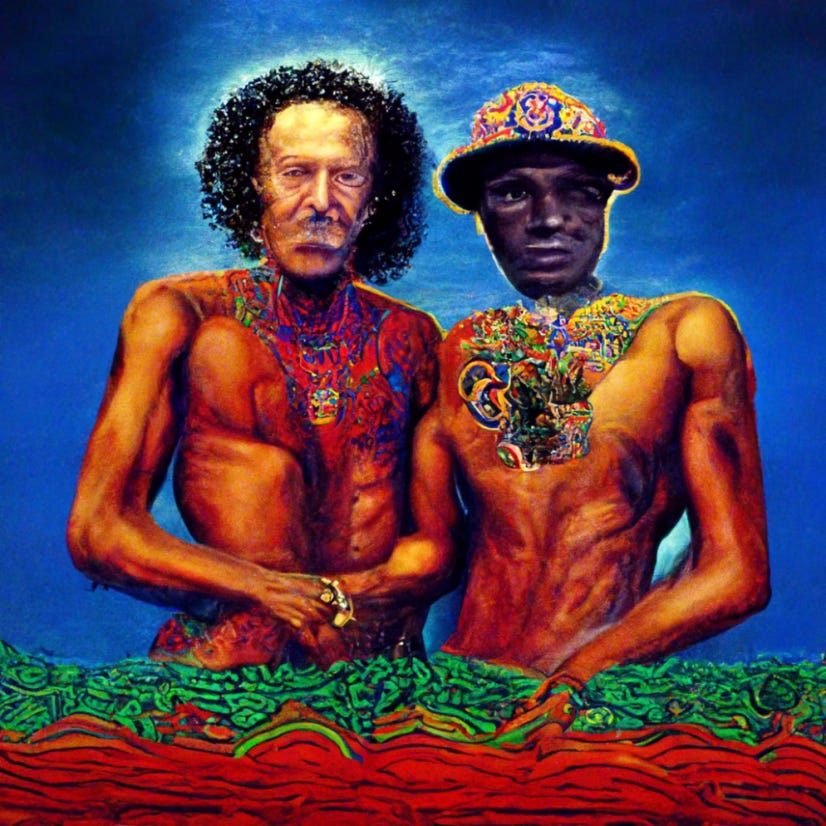 Supernatural Connection, the A.I.-suggested album title, is spot-on. These two artists may never shake hands or fuse limbs in this lifetime, but their respective bodies of work have an eternal spiritual link. To generate the cover, I used the prompt: “album cover, Carlos Santana & Young Thug, album called ‘Spiritual Connection,’ style of Mati Klarwein.”
