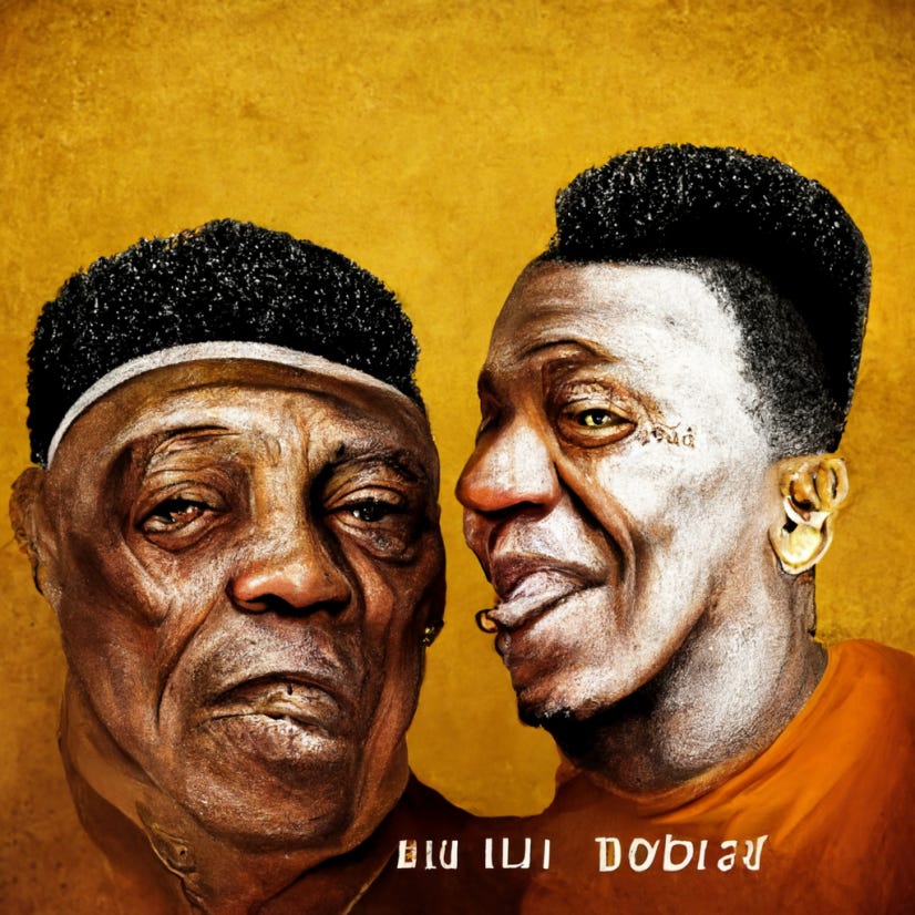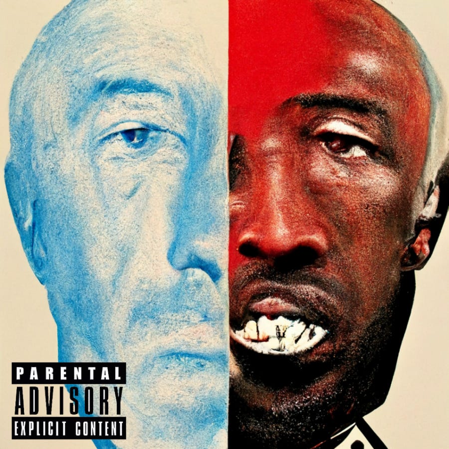 Mati Klarwein is the designer behind Santana’s 1970 sophomore album Abraxas, which the guy who works at Timewarp Records once told me “freaked me the fuck out as a kid, man.” Santana needed no visual accompaniment to accentuate his psychedelica. During his infamous Woodstock set, an accidental dosage courtesy of Jerry Garcia caused the neck of his guitar to shapeshift into slithering snakes, but he never lost his calm control. Abraxas’ bright collage cover—comparable in style to Klarwein’s other album artwork, like Miles Davis’ Bitches Brew and Earth Wind & Fire’s Last Days and Times, among several others—enhanced listeners’ interpretation and appreciation of the otherworldly sounds contained within the LP. Midjourney’s generated album art incorporates a similar psychedelic style, and although its facial recreations of the titular artists lack specific detail, it conveys the significance of this irresistible amalgamation.