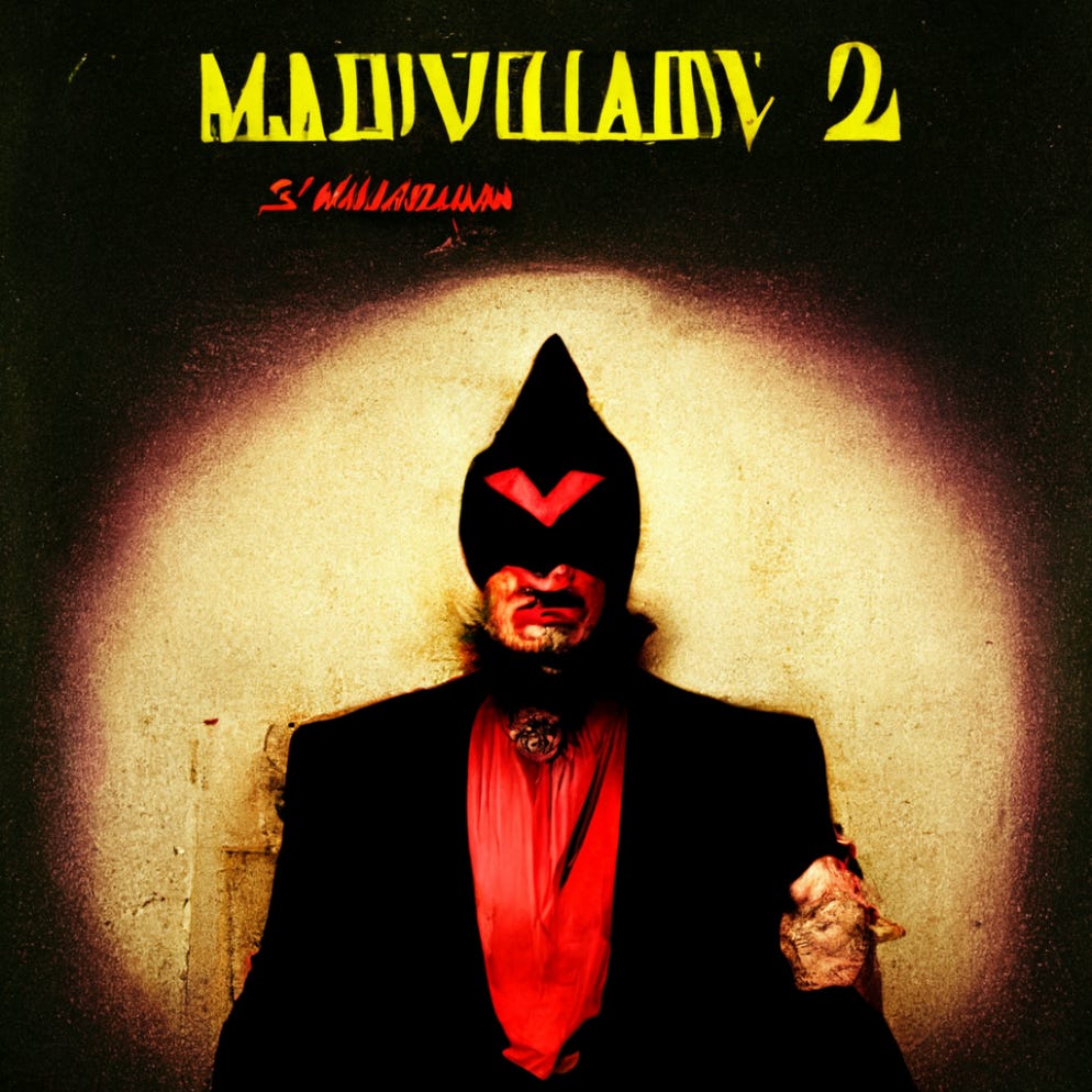 In honor of the first album’s iconic artwork, the prompt I gave Midjourney was “album cover for ‘Madvillainy 2’ by Madvillainy, photograph by Eric Coleman, style of Jeff Jank.” Coleman captured the legendary image of DOOM’s eyes wide behind his mask, and Stones Throw artistic director Jeff Jank tinkered with it to form it into the finished product. Midjourney went wild with its interpretation, forming DOOM into some sort of devil luchador in a bolo tie. Which is perhaps the most logical evolution of the character now that Dumile has transitioned out of this realm, and into the ephemeral one where Santana and Young Thug are eternally shaking hands.