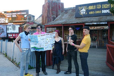 But with their wickedly good live set, Art Brut quelled all and any doubts I might have had. I've seen them three times and they seem to grow tighter and more confident with each visit. In particular, lead guitarist Jasper Future has become increasingly more assured since replacing Chris Chinchilla, who skipped out on the verge of their first U.S. tour. With the nickname "Back to the," Jasper wear a blonde pompadour, handles backing vocals, cups his ear to the crowd and lets off short but blistering solos, a vast improvement on recorded guitar parts that Chinchilla laid down on the debut. The difference between Art Brut pre and post-Future is as striking as the difference between The Hold Steady and their rawer Lifter Puller incarnation, where Tad Kubler languished on bass.