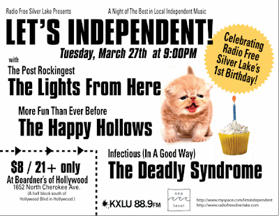 Joe from Radio Free Silverlake has things fairly figured out. Or so it seemed last night at his packed monthly Let's Independent night at Boardner's in Hollywood, when the cute pixiesh lead singer of The Happy Hollows broke mid-set to regale a story about a blog-obsessed friend of hers, who begged her to meet the man behind the blog, because she LOVES Radio Free Silverlake and reads it every single day. Which of course is awesome in and of itself because who knew blog groupies (bloupies?) even existed. Certainly not me. Whenever I meet someone who reads my blog, the conversation generally goes something like this:
