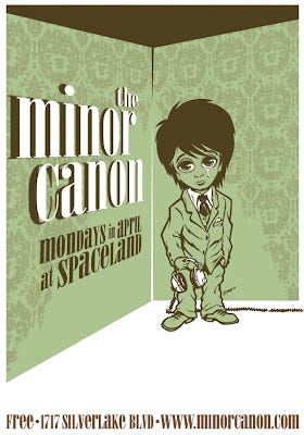 Of course, Minor Canon's impressive performance wasn't all that surprising considering that Larson is a road-tested vet of the LA music scene, one of the former members of a mid-90s band called Strictly Ballroom, a group who broke up after just one album but whose members eventually went on to form The Beachwood Sparks, Dntel (Jimmy Tamborello was in the band), and the Tyde. (Duke has the entire history here, if you're interested). In fact, the Postal Service was recorded at Larson's studio and Larson himself contributes guitar work on the new Dntel record that came out yesterday.