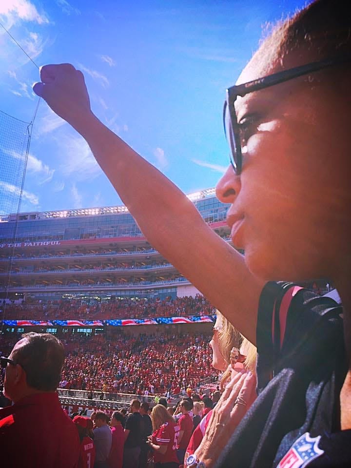 My wife and I were standing amongst the thousands of 49ers fans at Levi Stadium when the national anthem began to play. We watched as Colin Kaepernick continued his season-long protest and took a knee. Then I snapped the below photo of my wife protesting in support of Kaepernick’s cause. It was the last time we attended an NFL game and one of the last in which Kaepernick would get to play…maybe forever.