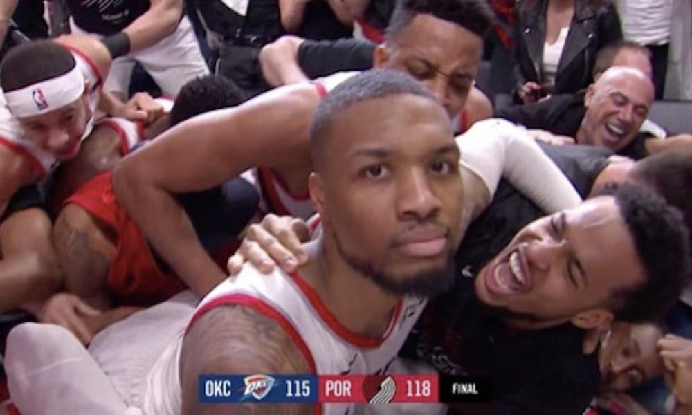 Here’s the thing, though! He’s kinda close to doing that right now! The Blazers, making their first Western Conference Finals appearance in 19 years, are just one round from the title fight, and the Warriors are sans-Kevin Durant for an undetermined amount of time. Lillard might have conciliatory Play of the Playoffs honors with his beheading of OKC, but he also has a shot at, you know, winning the playoffs themselves. If you haven’t been a Golden State fan since Stephen Jackson, Baron Davis, etc. were emptying Bay Area scotch reserves...well, you should definitely be rooting for Portland. To do otherwise would, once again, be dumb and stupid. Don’t be dumb and stupid!