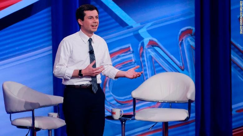 South Bend Mayor and Democratic presidential hopeful Pete Buttigieg is seen during a live CNN Town Hall moderated by Anderson Cooper at Saint Anselm College on Monday, April 22, 2019, in Manchester, N.H. Elijah Nouvelage for CNN