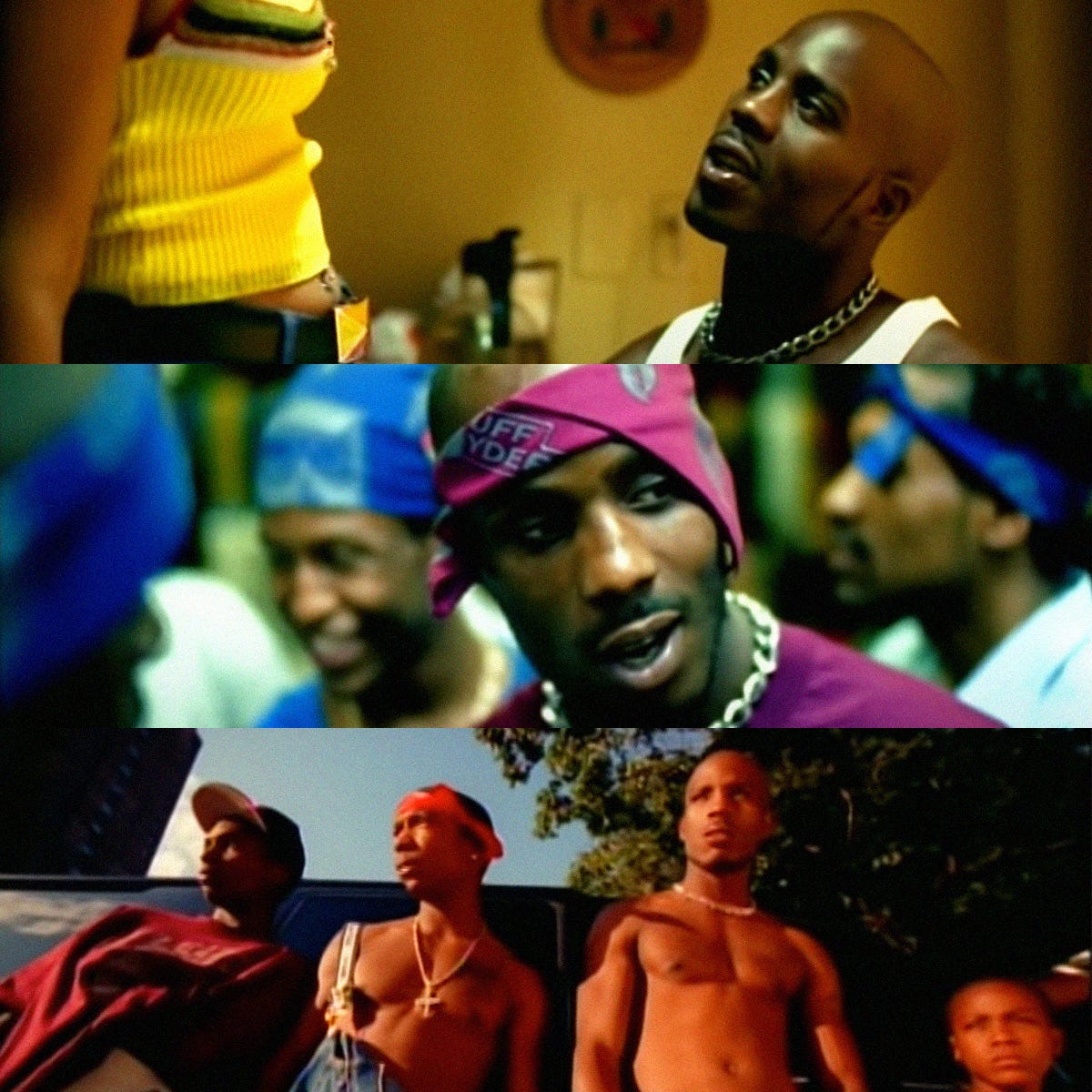 The most gutting frame from the clip is a defeated DMX leaning against a black SUV with his boys, wearing chains, tommy briefs, jeans and a broken heart. Briefly bowing his head, he watches the woman he can never be with and just lets her go, as water cascades from the block fire hydrant with the father of her children. He reminisces about whispering in her ear and a time when they slow-danced together and he held her same way, as the sun goes down.