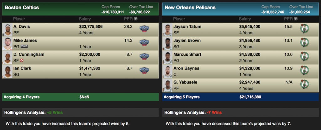 In addition to the pieces above, the Celtics would give the Pels the 2018 Lakers pick and the 2019 Memphis pick. The Celtics would be prepared to compete for championships for the foreseeable future with a healthy starting five of Irving, Cunningham, Hayward, Davis, and Horford, and a bench of Morris, Rozier, Ojeleye, and whatever postal workers Brad Stevens can transform into NBA players. The Pels would get a restock of assets and get younger in a market that has to remain exciting by selling the future. Their starting five without Boogie would be Holiday, Moore, Brown, Tatum, and Baynes and a solid bench of Mirotic, Smart, and Miller. The Pels could get an incredible return on a deal the Celtics would have to take and could avoid the eventual departure of Davis from a small market and mismanaged franchise. Jerry West would do it.