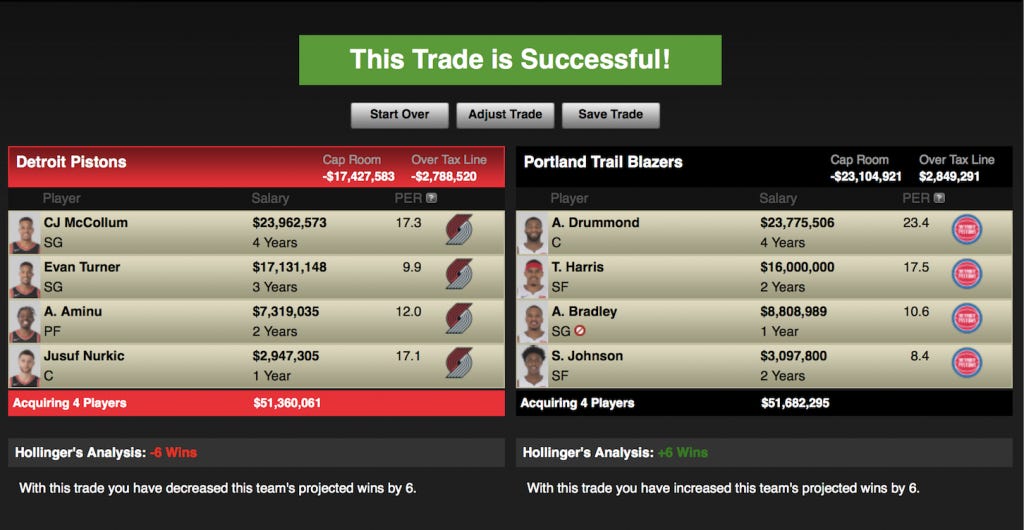 Earlier this week Damian Lillard met with Paul Allen, the Blazer’s owner, to discuss the future of the team. The meeting likely occurred because of the team’s terrible roster construction and their general lack of direction. The Blazers need to do right by Dame, who is by all accounts a phenomenal talent and my preferred keeper instead of McCollum. To appease their star the Blazers have to get good fast. By adding Drummond they finally have a legitimate second star and a rim protector. Harris adds a scoring punch and Johnson gets a chance to improve his game under Terry Stotts. The team also gets Avery Bradley, who recently settled a rape case against him out of court for an undisclosed amount. Bradely is currently in the last year of his contract and hopefully his career. But in a league where Derrick Rose can still make millions, Bradely isn’t likely to go anywhere. Detroit likes this trade as they get a chance to begin rebuilding with a certified star and a Top-10 protected 1st round pick from the Blazers in 2018. Aminu and Nurkic provide enough talent to keep team respectable in the eyes of their fans.