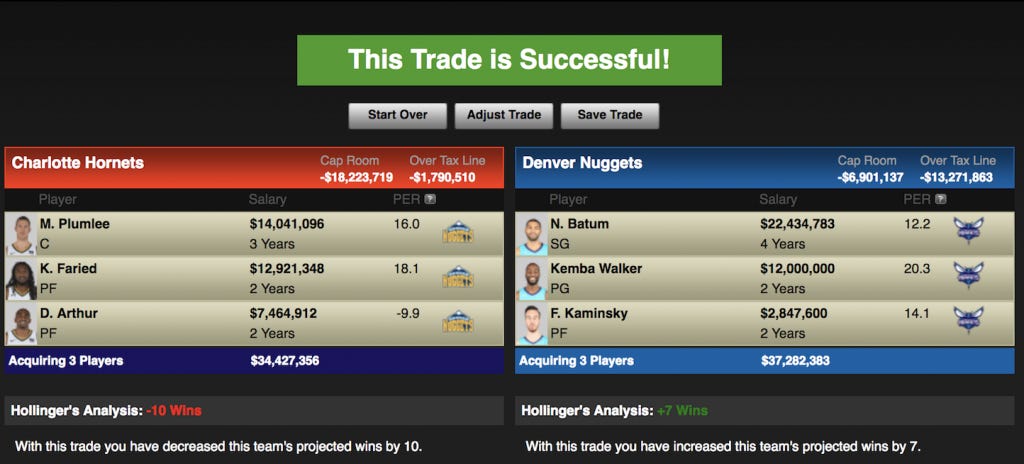 Again, I was looking to upgrade the Nuggets’ backcourt, but this time a bit more dramatically. Here the Nuggets get to plug Kemba Walker alongside a healthy starting lineup of Murray, Chandler, Millsap, and Jokic, with Kaminsky, Batum, and Barton coming off the bench. This team would be fun as all hell and a nice dark horse to make a run in the playoffs. The Hornets would shed some long-term salary and completely fuck up their positional allocation, but hey, if you want to rebuild this is where you start, especially since Denver will send their unprotected 1st round picks from both 2018 and 2019.