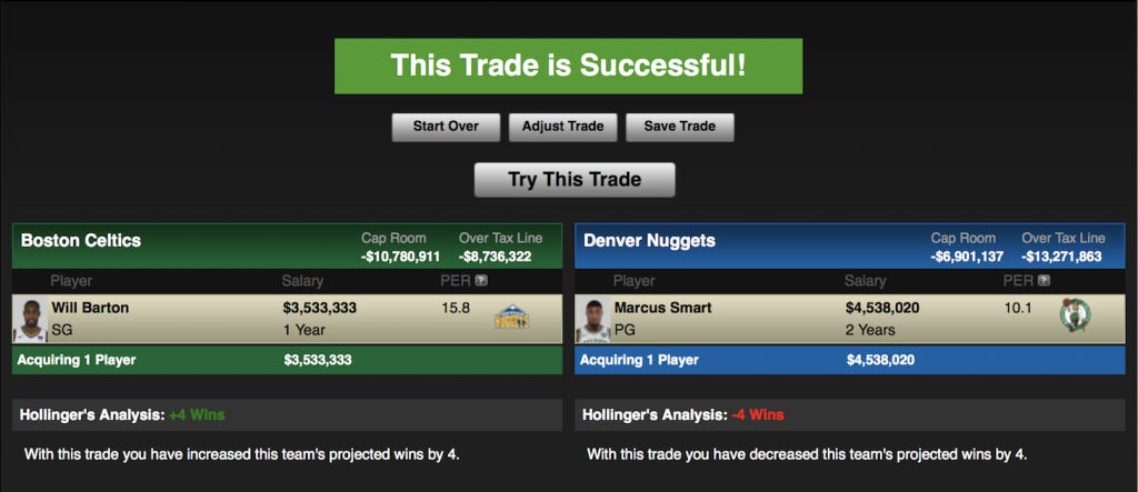 This one is simple. The Celtics need another reliable scorer and the Nuggets could use a bit more defense from their guards. Boston gives up Smart, who is going to be a pain in the ass on and off the court when he demands an egregious extension this off-season despite shooting 35.8% from the floor and 29.3% from three for his career. Barton offers the ability to get his own shot without disrupting the chemistry on defense, of which Boston ranks 1st in the league. The Nuggets get a bit deeper in a place they could use help, as Mudiay and Murray are not very good defenders.