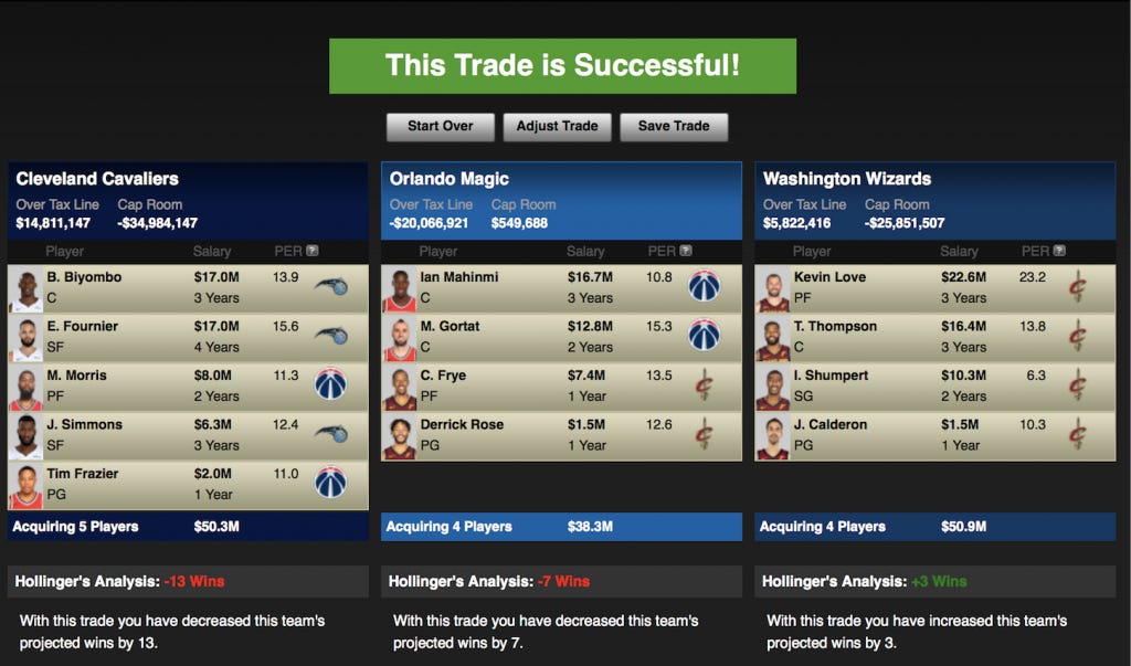 Here the Cavs get to unload their assortment of shitty players (and Love) that LeBron brought in and exchange them for less shitty players that still won’t be enough to help them get back to the finals. Nonetheless, the Cavs convince themselves otherwise. In their minds, Biyombo is the rim-defending big they need, Fournier the two-way wing threat Crowder hasn’t been for years, Simmons the guy LeBron played a few times and liked, Morris the enforcer, and Frazier the guy they need because they’re trading senior citizen Calderon and no-kneed rapist Rose. The Wizards make out like bandits and obtain a third star in Love, a defensive and mobile center in Thompson, and a few scrappy and experienced guards to bolster their bench. They also don’t have to look at Gortat anymore and manage to get off the albatross of a contract that is Ian Mahinmi. The Magic absorb some cap and take on a couple expiring contracts, but what they also get is a 2018 unprotected 1st round pick from Washington and another unprotected 2018 1st Round Pick from the Cavs (not the Nets pick). Also, Gortat gets to play in his adopted hometown for the remainder of his career and fulfill his life-long dream of moonlighting as Rattigan from the Great Mouse Detective at Disney World on the weekends.