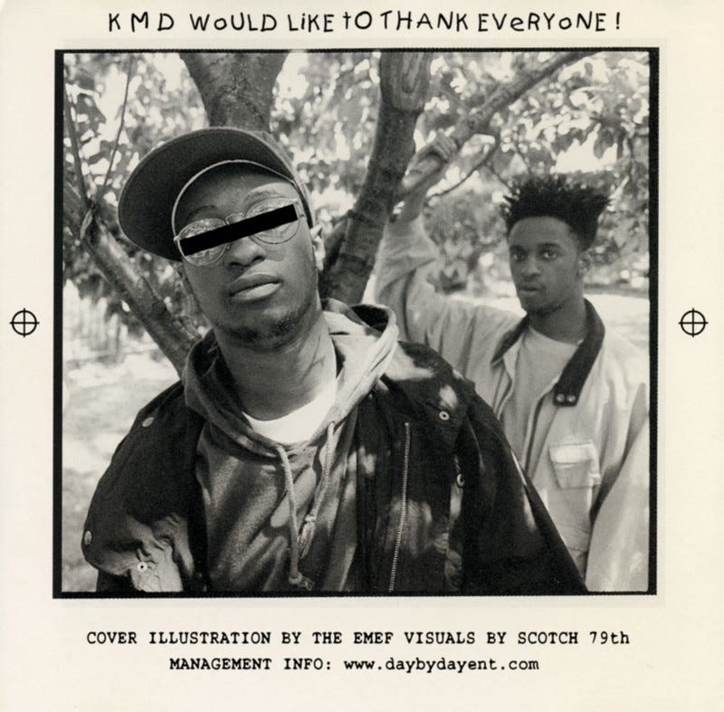 KMD were signed to Elektra, home of Brand Nubian, and the recently signed Leaders Of The New School and Pete Rock & CL Smooth; Dante Ross was assembling a squad. KMD’s “Peachfuzz”/”Gasface Refill” 12” dropped in December 1990, but it took a while to climb up the charts. Once the video hit BET’s Rap City and Yo! MTV Raps, it steadily gained more and more traction, even getting frequent play on college radio shows like MIT’s "Dope Jams Show" on WMBR 88.1 FM, Emerson College’s "Rap Explosion Show" on WMBR 88.9 FM, and Northeastern’s WRBB 104.9 FM -- which was among the first in the nation to regularly play rap on air.