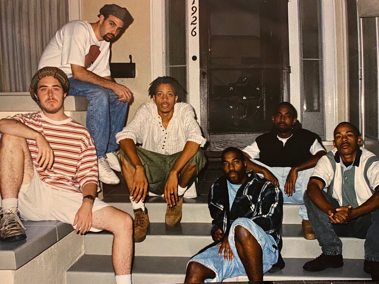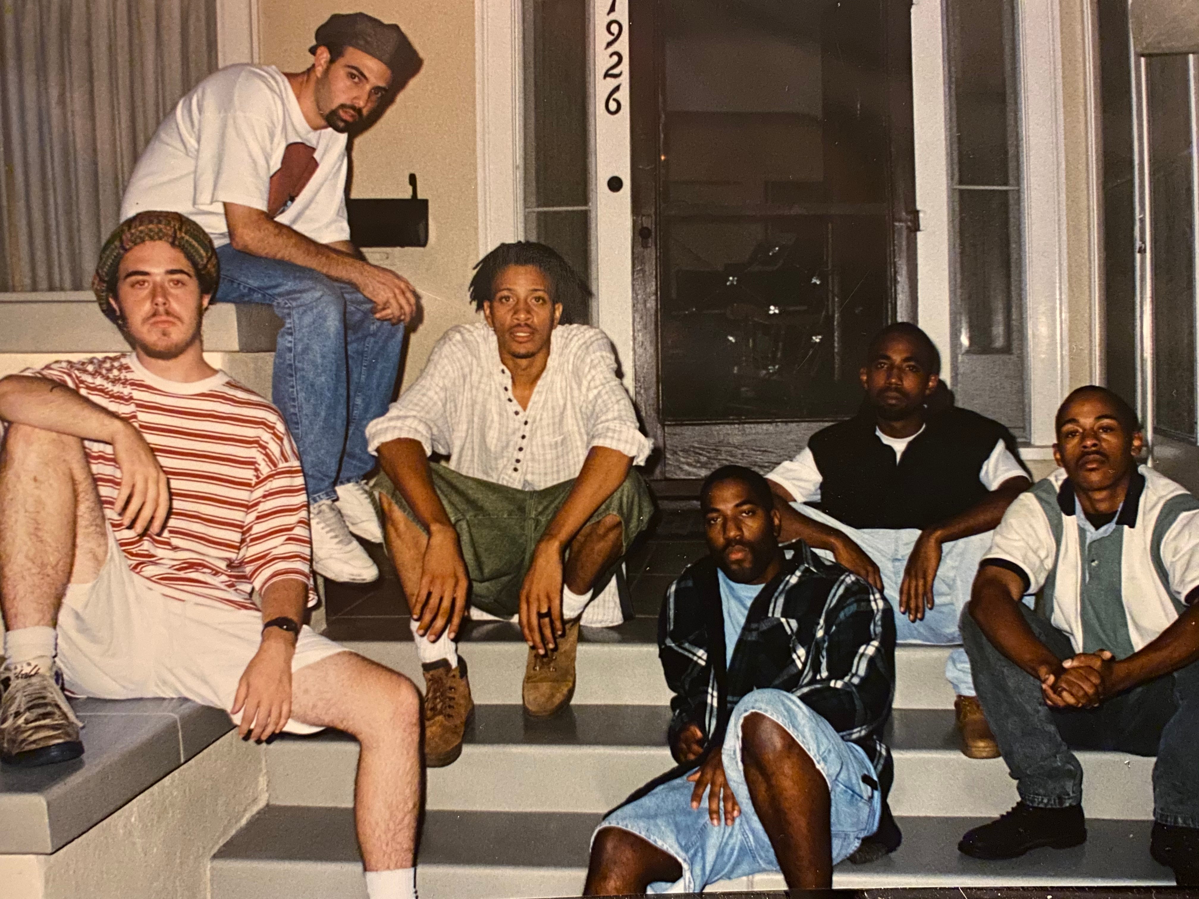 Early group photo of Jurassic 5 on the steps of Cut Chemist’s childhood home