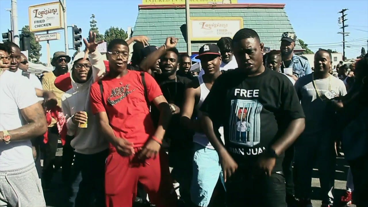 The premise is simple: in various shades of red, Hot Sauce and company dance in front of a 7/11, a Louisiana Fried Chicken, and the Crenshaw Mall's Victoria’s Secret.The song seems to have been made with no expectations that anyone outside of Hot Sauce’s relatively limited sphere of influence might hear it. The recording quality is poor, and the YouTube comment section contains words of support from people who personally know performers involved. Yet there are also several comments from people claiming to be crips, but enjoying the music despite the artists’ blatant affiliations. There’s also, fittingly, one declaring “luv from West Oakland.” It’s a hyperlocal song but, as has been the case with other artists from lesser-tapped pockets of the city, it’s organically grown and spread far beyond its neighborhood borders after being posted online.