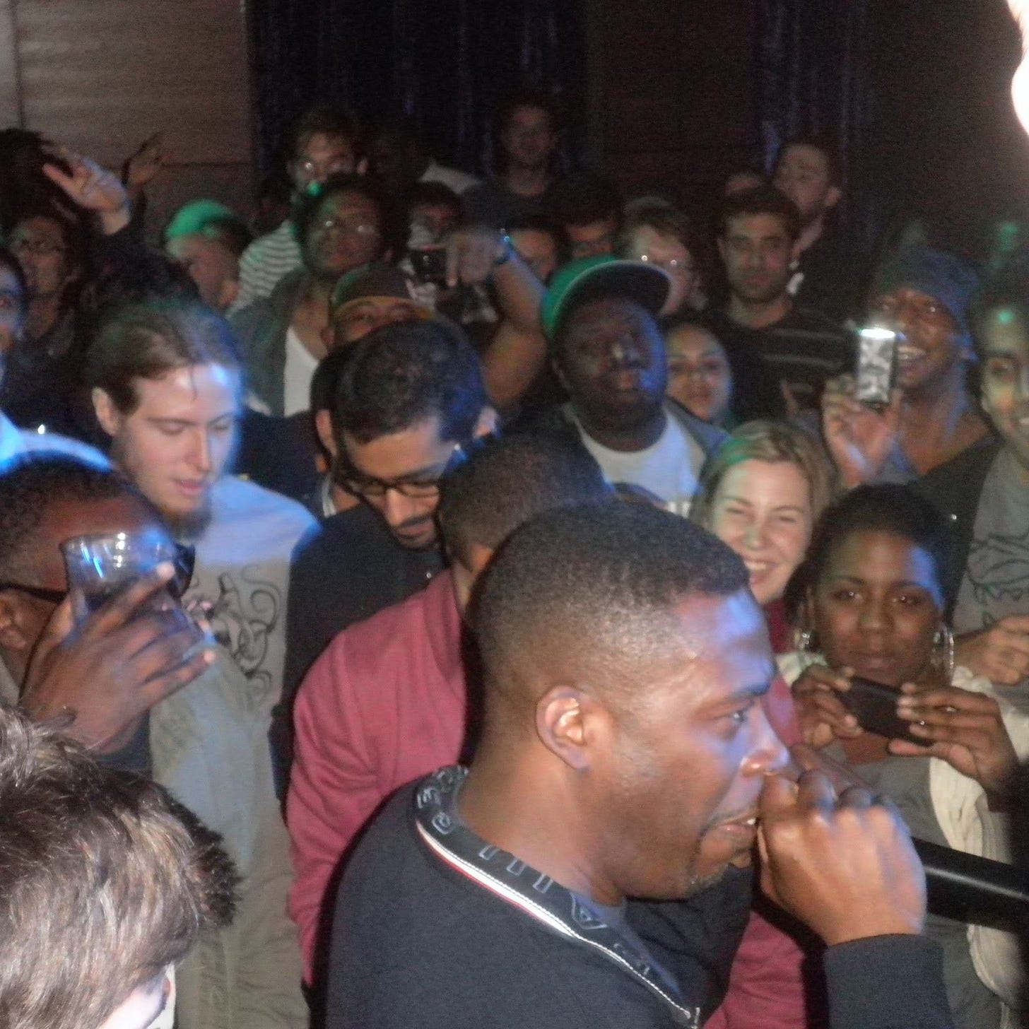 He would continue to perform from the eye of the storm for his entire set. Onlookers leaning on the bar or gawking from the terrace above rushed the main floor to participate in the melee. Gza encouraged documentation of the event, demanding the sea of camera phones to "Youtube this muthafucka'," "Facebook this bitch," and "Twitter this twat!"