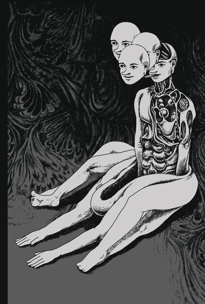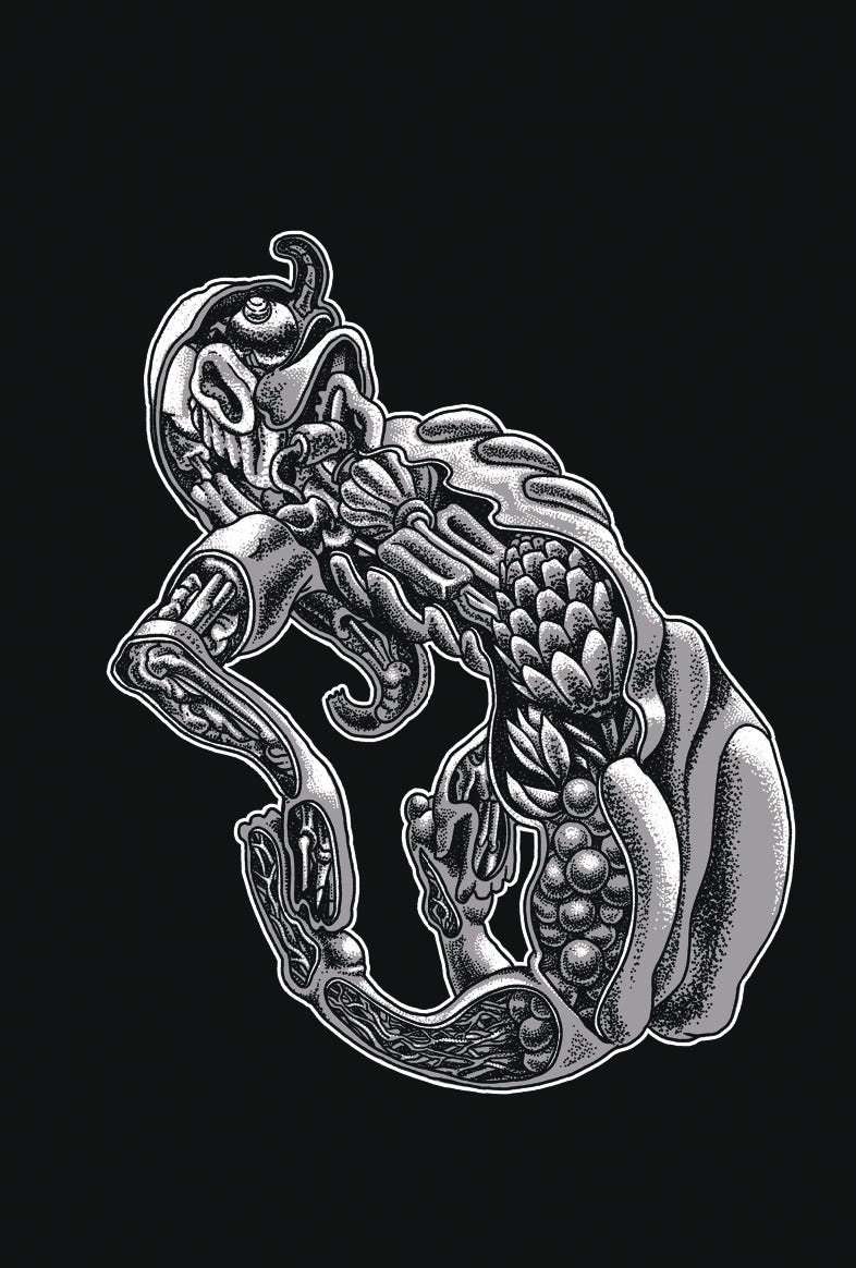 Murlo: There's a lot of things I get drawn to, imagery-wise. There’s anatomy, like you mentioned—even Cronenberg-style body horror. As for the cult aspect, I've followed this "AI"—really, machine learning—stuff for a long time. With the Metaverse and such, people talk about it in a very cultish way so it felt like a good vessel for it. The story is about the cult members mostly, but I try to leave things open, where I can work on different characters and such. I try not to completely explain a story and define everything; I like the idea of being able to revisit stuff.