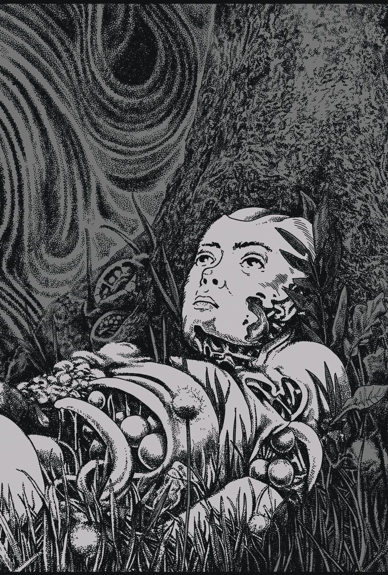 I like the idea of comparing the story's A.I. with a pearl. A pearl is, essentially, an immune response, but we all take it to be something else. It's beautiful and we all wear it around our necks, but it's a calcified protection against a grain of sand. When it comes around to telling the story, one thing I learned from Dolos is that I ought to play to my strengths. I don't think that writing on-the-nose graphic novels is my strength. Here, I went a bit more left-field. I wrote poetry that wasn't even good, but I like the idea that the person who wrote it was so enamored with something that they couldn't help it.