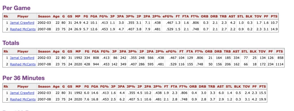 After the KG trade, McCants was thrust into a larger role on a rebuilding team and had his best season in his third year where he started occasionally and averaged 14.9 points per game in 26.9 minutes. To attempt to put this into perspective, I compared Rashad’s third year to the third year of arguably the best sixth man who ever lived, and it’s not really fair and there’s a million caveats and nits to pick, but consider: