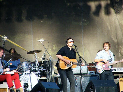 By song two, "You Are My Face," the band started to press its foot lightly on the gas, with Cline delivering pin-point guitar licks and the band seemingly feeding off the laid-back but excitable crowd and the warm white sun setting slowly in the West. The highlight of the set came early, during "Spiders (Kidsmoke), usually a linchpin of the latter half of Wilco performances, but with only an hour and fifteen minutes allotted, the hypnotic Krautrock-infused jam was deployed early and with maximum effect. Particularly animated, mid-way through the dozen minute-song, Tweedy began clapping his hands and addressing the crowd. "San Francisco. This is the home of the best concert goers on the planet. I know you guys can clap your hands....Even if you hate Wilco, it's okay, I know you know how to keep rhythm." In turn, a sea of hands started keeping time and the band descended further into the jam, seamless in their transitions, effortless but never condescendingly winking at the audience. During "Hummingbird" Tweedy dashed around the stage with the youthful joy of a small child. On "I Am Trying to Break Your Heart," he conjured the opposite emotion, making a very well-known song played in front of a massive audience sound incredibly personal and vulnerable, especially surrounded by the cracking tape loops and glitchy static. As for "Jesus Etc.," it was pretty much miraculous, yielding the sort of transcendence you really only get from the truly great songwriters. Sure, Sky Blue Sky might've been a little staid compared to Summerteeth, A Ghost is Born and Yankee Hotel Foxtrot, but even the Million Dollar Man would be hard-pressed to buy a better band than Wilco.