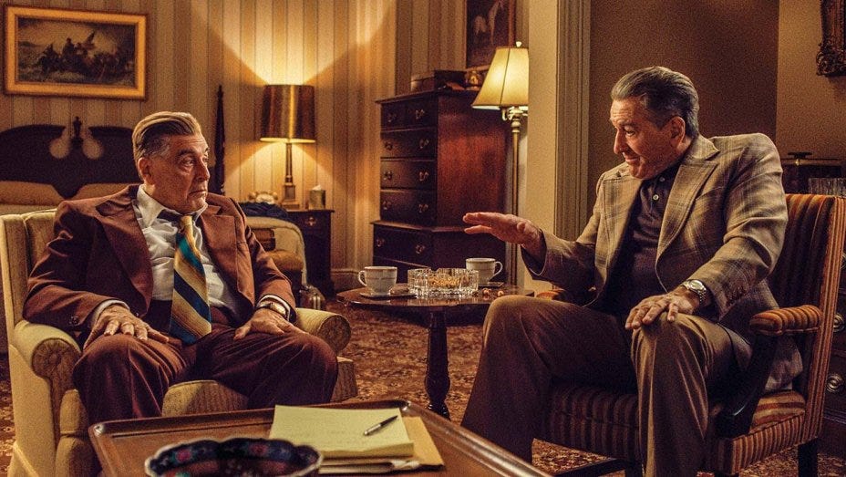 Martin Scorsese has killed hundreds, even thousands of people throughout his illustrious career. He kills many men in the Irishman, many on screen by the hand of his great muse Robert De Niro as Frank Sheeran, a button man for the Philly mob and the bag man for Al Pacino as Jimmy Hoffa, but many more offscreen, as the demise of peripheral characters are explained in brief captions, underlining their tragic disposability.