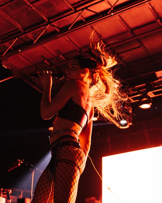 The 21-year-old British TikTok sensation came out on stage rockin’ a purse, which was very Aretha Franklin of her. (Aretha made promoters pay her in cash, which she’d then carry in her purse on-stage to keep close). No one would say PinkPantheress has a voice like Aretha’s — nor would anyone bother to make that comparison, besides me, a weirdo — but she did present a certain star-like charm on stage, balancing her drum and bass-backed pop tunes with cheeky crowd banter. At one point she let a die-hard fan of hers, a teenage boy named Allen, scream as loudly as he could into the microphone, just for fun. He did, and it gave football to the nuts (sorry, Allen).