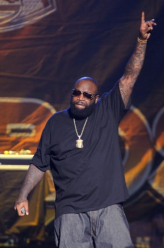 There’s an appropriately half remembered anecdote I can't find or confirm from Cypha Sounds and Peter Rosenberg’s Old Testament hip hop podcast Juan Epstein. In it, perhaps Just Blaze or some similarly crucial North East producer from the early aughts, remembers Ross when he wasn’t Rick Ross, he was merely Cool Rick, a guy who would be quietly hanging out blunted in the corner of recording sessions for the Roots. And this is my favorite version of the origin myth of Rick Ross. That he started as an Ali G, Mister Brainwash style of guerilla performance art, a gag intended to hold a mirror up to popular rap music that got away from us all at some point.