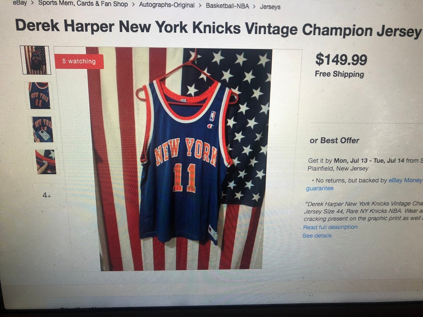 6:58: Derek goes Gervin. Christ, I love this guy. I actually just Google shopped “Derek Harper Knicks Jersey”, found this and immediately purchased it. Pay no attention to the $150 price tag for what was probably a $20 Champion replica of a guy who played on the Knicks for two and a half seasons, that in the description it says the lettering is cracked and there is some kind of stain somewhere, the seller lives in NJ, has an American flag in the background of this shot for some reason and almost certainly voted for Trump. This is a completely normal and good purchase, let’s move along.