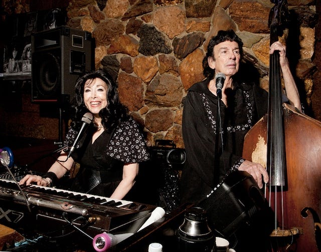 Mentored by Benny Goodman drummer Gene Krupa, Marty alternates between upright bass and shuffling drums. Sometimes he sings; other times, Elayne warbles while alternating between piano and flute.