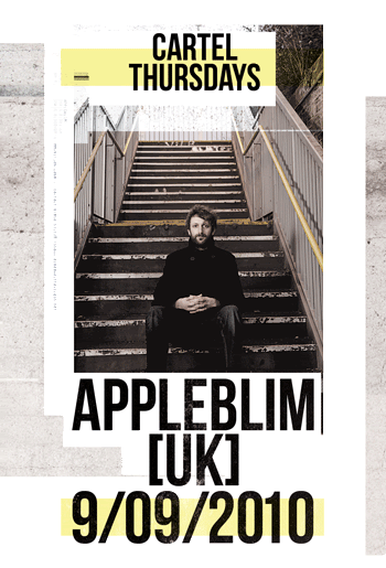 My horrible puns aside, Appleblim's impact on Dubstep and bass music over the past few years has been immeasurable. While former Skull Disco partner Shackleton got the techno love and Villalobos remixes, Appleblim veered a course towards looser, funkier and slightly lighter terrain planting him firmly in bass music's sonic center. Think of them as Lennon and McCartney except with "She Loves You" as a cavernous drone of vaguely oriental tones commenting on the Middle-Eastern peace process. Since then, Appleblim founded a new label Apple Pips and released a volume in the Dubstep Allstars series which still stands as a high water mark for the genre: a dark, dubby but not inaccessible odyssey at a time when Dubstep's wanton aggression was starting to infringe on it's creative spirit. The reason for all of this retrospective praise of course being that senor 'Blim is coming to town and kicking off a new weekly bass music event in Montreal, namely Cartel Thursdays at Academy. With my fair city's cup overflowing with DJ nights these days, I tend to avoid the promo game but exceptions must be made in the case of superior bookings and bringing over a left of center UK originator for your first show qualifies. I will be in attendance, signing autographs and mumbling to myself in the corner by the sub. For those on the fence or outside the area code, the customary artist mix follows. Appleblim @ Cartel Thursdays 4445 St-Laurent Montreal Download: MP3: Appleblim - FWD/Rinse Mix 10'