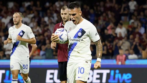 In their 4-0 evisceration of Udinese on December 9th, Inter Milan maintained their top position in Serie A. The only match they’ve lost in any competition was a 2-1 affair at home to Sassuolo near the end of September. The Udinese match was over before Lautaro Martinez scored, but his effort kept him six goals ahead of Olivier Giroud as the Serie A’s top scorer with 14 goals. The Argentinian striker has obviously had a great year in international results, but his play for Internazionale this year has added a dynamism to their Serie A campaign that you wouldn’t expect if you exclusively watched their Champions League outings. His playmaking ability was at its heights against Salernitana on September 30th, when he scored four times in thirty minutes, a talismanic performance for El Toro. Besides the penalty he scored in the 85th minute, all the goals occurred in similar fashion: Martinez controls the ball in Salernitana’s half, pulls the defenders towards himself, then distributes to the wings and breaks for the inevitable cross. The first came after just seven minutes on the pitch. Martinez pulls a long ball down from keeper Yann Sommer and plays it out to the left wing for Thuram. Then El Toro pierces the middle of the defense. Martinez holds his line until Thuram serves him back a sneaky cross that allows him to tap in the ball as he skips over Guillermo Ochoa. The second is a volley with a seismic punch. Lautaro pounds it down into the turf and it curls away to the keeper’s right. His fourth goal of the evening was the most standard, a first-touch redirection of a cross from Mkhitaryan that effortlessly rolled into the far corner.