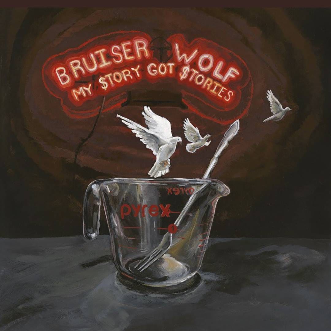 Now it’s January 2024. My first favorite rap album of the year has arrived: My Story Got Stories from Detroit’s Bruiser Wolf. It’s a thoughtful reflection of hustling and dope dealing, featuring live reports from wild threesomes (“2Bad”) worried and regretful dispatches from the delivery room lobby (with a plot twist where the “baby mama is my side b*tch”), and nearly 40 minutes of charisma.