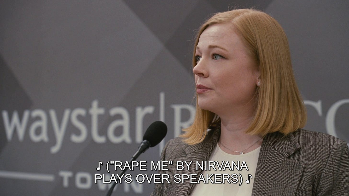 Shiv is tapped to do a speech for the company, her first, an introduction/townhall meant to serve as damage control. In one of the more shocking and cringe moments in the show’s history, while she is speaking, Nirvana’s "Rape Me" plays loudly from speakers near where everyone in the company is congregating. (The shot of Roman trying his best not to laugh is brutal in its honesty). Shiv leaves the hall, upset at her brother for embarrassing her. Snook is excellent here. Her face is angry and on tilt at the same time, desperate to maintain composure. She spits in a book that Ken left on his desk, declaring war against her brother (This might be the meanest thing that Ken does to anyone on the show. It’s cruel and childish. Hard to feel bad for what is coming, and yet).