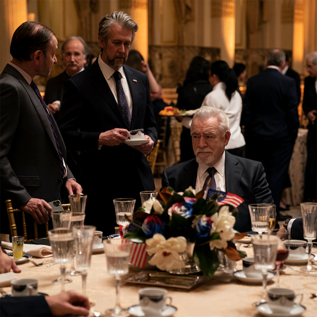 Abe: I mean, yeah. Absolutely, it’s text. There were so many crushing details in this episode. The way Wambsgans is training himself for prison food, his agenda-free willingness to eat Greg’s sins as he’s held aloft on the shoulders of conservative dude bros, he may, at this point be the single character who has learned/changed the most since the series pilot. But let’s get to the Con moment since I didn’t get to it in recap. We had a moment where Logan nearly made himself Joe Kennedy, with Con and Panhandle Pete as his JFK and RFK, what was that about? Logan sniffing his own gas? All it took was Greg giving mild trepidation to piss on the embers, If that’s all it takes, did Logan have the right dream?