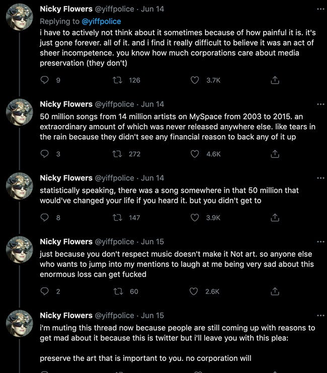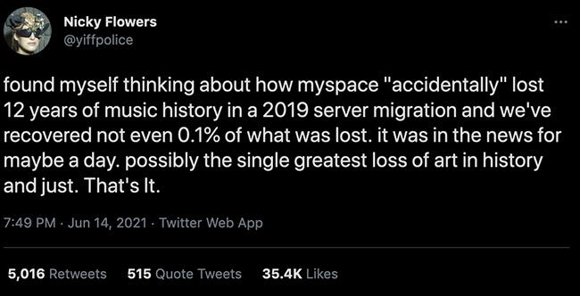 Without reading the replies, it seems obvious that many of them ridicule the author for being upset about this. They don’t think that the Myspace mishap was a big deal. Which goes back to the original tweet in the thread. “It was in the news for maybe a day. Possibly the greatest loss of art in history and just. That’s it.”