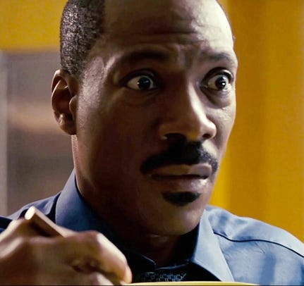 It’s hard to understand now because with actors like Pitt or DiCaprio, the bar has been raised, and like LeBron, the idea of a prime has been extended and edited, but Eddie falls into an older tradition of a comedian wunderkind who shoots his shot, rides the wave and then coasts on the borscht belt circuit, playing houses packed with schmucks over the high holidays, taking the bag and running into the night. What I struggle with when it comes to Eddie is the why. He seemingly had access to all the old magic and chose to starve out his patient fans. I’ve read interviews with Landis and John Carpenter from the mid-90s expressing their frustration with Eddie on set. That they would try to push him towards his comedic talent and he’d resist because he had a different idea for how he wanted to present to his audience. It’s quite simply stupidity masquerading as savviness, a near-lethal case of smartest guy in the room syndrome. There is a spite, almost a malice to it all.