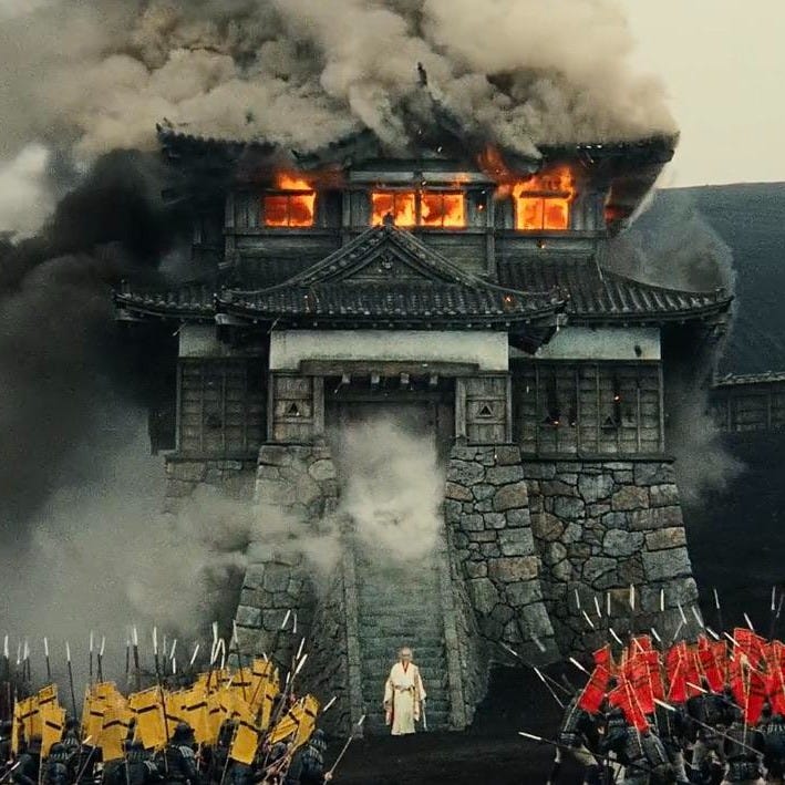 The sky is an indolent blue gray and Hidetora Ichimonji awakens to learn his sons and their armies have arrived to depose him and soak the third castle with his retinue’s copious blood. Taro and Jiro pry open the gate and set their guns and arrows on their father’s unyielding warriors. One watchtower becomes a fireball against the desolate landscape and another fills with piles of shattered men with bolts protruding from their chests, limbs, and eye sockets. Hidetora rushes down the steps of his tower to find his concubines killing themselves. Those who don’t die on their knives throw themselves in front of enemy guns to shield their master. The elder Ichimonji is meant to kill himself but unbeknownst to his disinherited sons, he snapped his sword on a soldier’s armor. He’s trapped -- denuded of family, protectors, even the reprieve of suicide; he watches blood pour from an overhead landing and he avoids the accusatory glares of corpses. Without warning, the sound of a distant gunshot breaks the nightmare and resumes the inexorable though no less terrible march of reality.