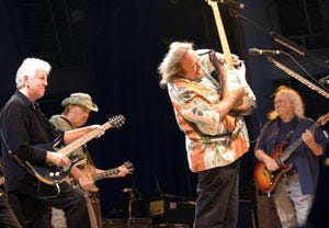 Excerpt from CSNY @ The Hollywood Bowl "Crosby's high point of the show came on "Almost Cut My Hair," which managed to not sound ridiculous despite the fact that Crosby is very very bald. Follicular difficulties aside, the man can still sing and Neil Young's presence seemed to really energize his performance...The high points of the show came from Young. From his fiery rendition of anti-war classic "Ohio," to his cover of Hendrix's "Star Spangled Banner," to the concluding song, "Rockin' in the Free World," Neil Young proved that even at 61 years old he still may be the best performer in rock music. Where Bob Dylan's voice has been ravaged over the years, Neil's frail slightly off-beat falsetto still rang clear and crisp up into the starless Hollywood sky and for a moment every withered hippie in the bowl believed that it was 1969 all over again." The Full Review