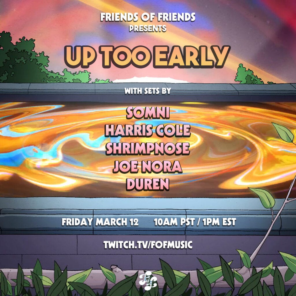 Somni: The whole thing kind of came around because I kept sending Leeor a bunch of music, homies who were doing really cool things or artists that I’d found out about through mutual friends, like “BRO YOU GOTTA SIGN ALL THESE PEOPLE LISTEN TO THIS SHIT!!” And, of course, Leeor was like “man, I can’t sign like five new artists in a week, the label’s already packed!” haha. But I think it sort of lined up perfectly with this idea that Leeor had in the back of his mind already, the artist curated compilation thing and the continuation of the Up Too Early series.