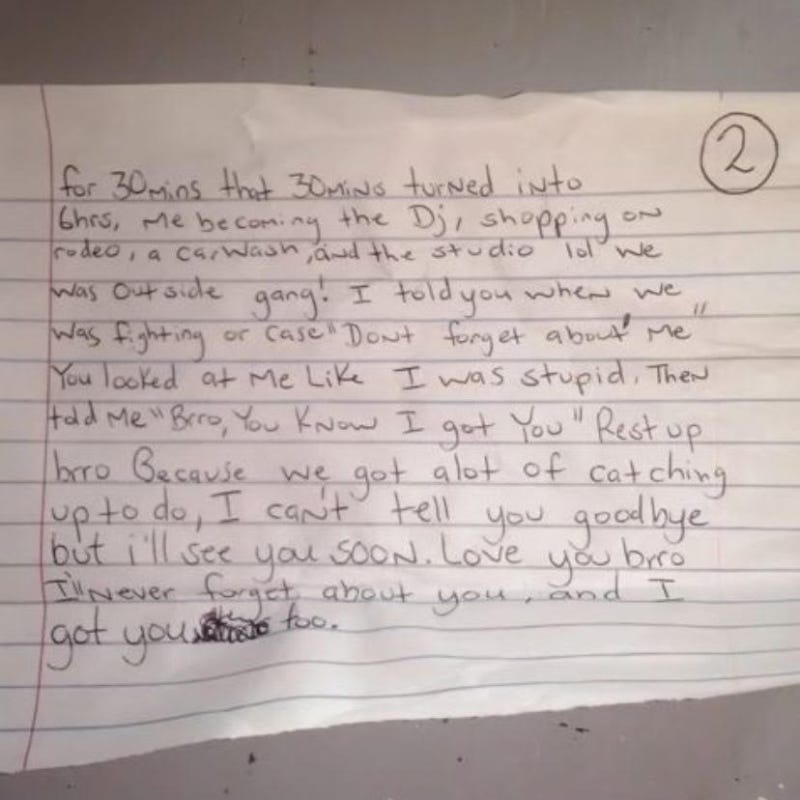For 30 mins that 30 mins turned into 6 hours, me becoming the DJ, shopping on Rodeo, a carwash, and the studio lol we was outside gang! I told you when we was fighting UNKNOWN case “Don’t Forget about me” You looked at me like I was stupid, then told me “Brro, you know I got you” Rest up brro because we got alot of catching up to do, I can’t tell you goodbye but I’ll see you soon. Love you bro I’ll never forget about you, and I got you too.