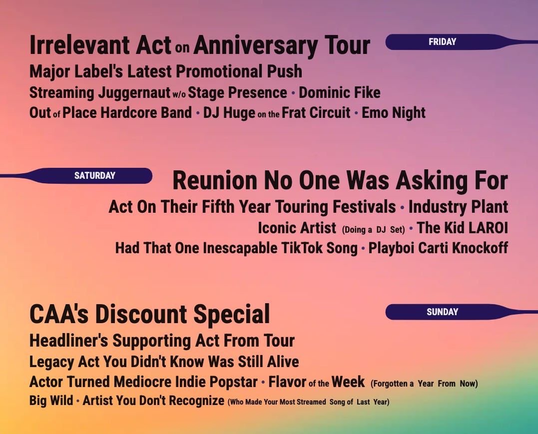 With the arrival of these niche genre/era events, industry homogeneity has experienced its biggest fracture since the first Coachella. Part of this is a breath of fresh air, as anything new would be since all the established events have more and more begun to resemble one another. In 2024, the legacy festivals have mostly forgone any singular vision or nuance in their bookings, replacing tastemaking with an overly data-minded approach that seems more designed to hedge risk than inspire enthusiasm. This problem is compounded when they are all dipping into the same shallow wells of major labels and oligarchic booking agencies, closing the door on smaller independent artists who once could leverage festival bookings to grow into bigger stages in their career. Still, I view the new events with skepticism, seeing them as cheap nostalgia bait strong-armed into reality by corporate-backing.