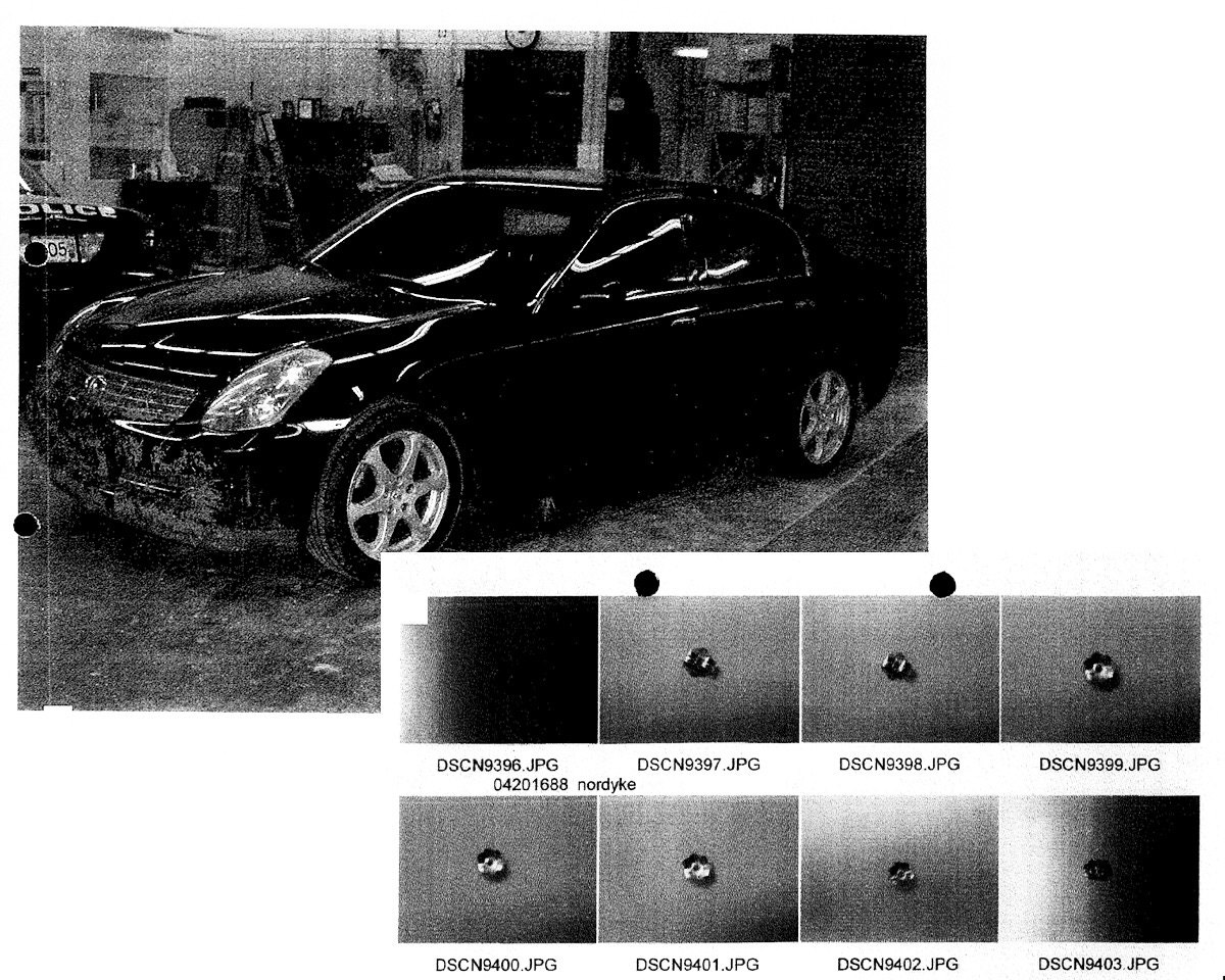 There were three spent 7.62X39 Wolf shell casings found in the backseat — the same kind located at the crime scene. There was white paint all along the passenger side of the car, suggesting that it had been used to ram a white vehicle.